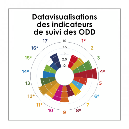 Les datavisualisations du site Agenda 2030 proposent deux entrées principales : une vue d’ensemble des 17 ODD, qui permet d’évaluer globalement les progrès, et une analyse détaillée par objectif, offrant un accès direct aux indicateurs et à leur évolution. Elles facilitent l’interprétation des données : certaines tendances témoignent d’avancées, tandis que d’autres mettent en lumière des domaines nécessitant des efforts accrus, comme la vie terrestre ou les institutions efficaces.